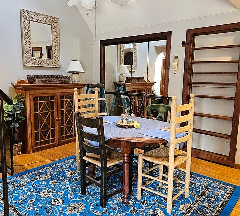 - Ins, Floor 1: Living Room, Dining Room (with hidden appliance connections and a spiral stairway to the second floor), Kitchen, Bedroom, Library, Office and Half-Bath., Floor 2: Two Bedrooms, One Full Bathroom, Storage, Floor 3: Finished attic space is accessible by built-in ladder.