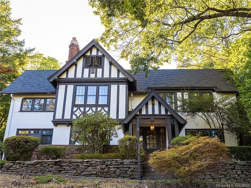 10 Saint Ronan Terrace is the very last home the inside of which was designed by the architect Eero Saarinen. This is particularly special because he designed it for himself and his family. Although he died before he could move in, his wife Aline, and his son Eames did move into the house and, reportedly, completed some of Saarinen’s unfinished details. Perched on a knoll on a quiet cul de sac with views of East Rock is this dramatic light filled Neo-Tudor with high ceilings and clean modern lines and finishes. Generous size entrance foyer is flanked by both the formal Living Room with fireplace and Dining Room. As it is throughout the house, oversize windows let the natural light pour in. Off of the LR is a south facing Library with Saarinen shelving, fireplace and French door to the private bluestone patio. The kitchen has an adjacent butler's pantry, breakfast room and back hall entry with storage space. A grand staircase with a large west facing leaded glass window provides light to the entrance foyer as well. Currently the 3-room primary bedroom suite with fireplace and full bathroom includes abundant closet space, sitting room and second library. There are two additional bedrooms on this floor. The third-floor features two bedrooms plus an extraordinary, pitched ceiling family/rec room with fireplace, full bath and Gothic style doorways that were apparently inspired by a home that was owned by Saarinen's father. Two car detached garage. gas heat. A must see in a perfect quiet location within an easy walk to the university and downtown.