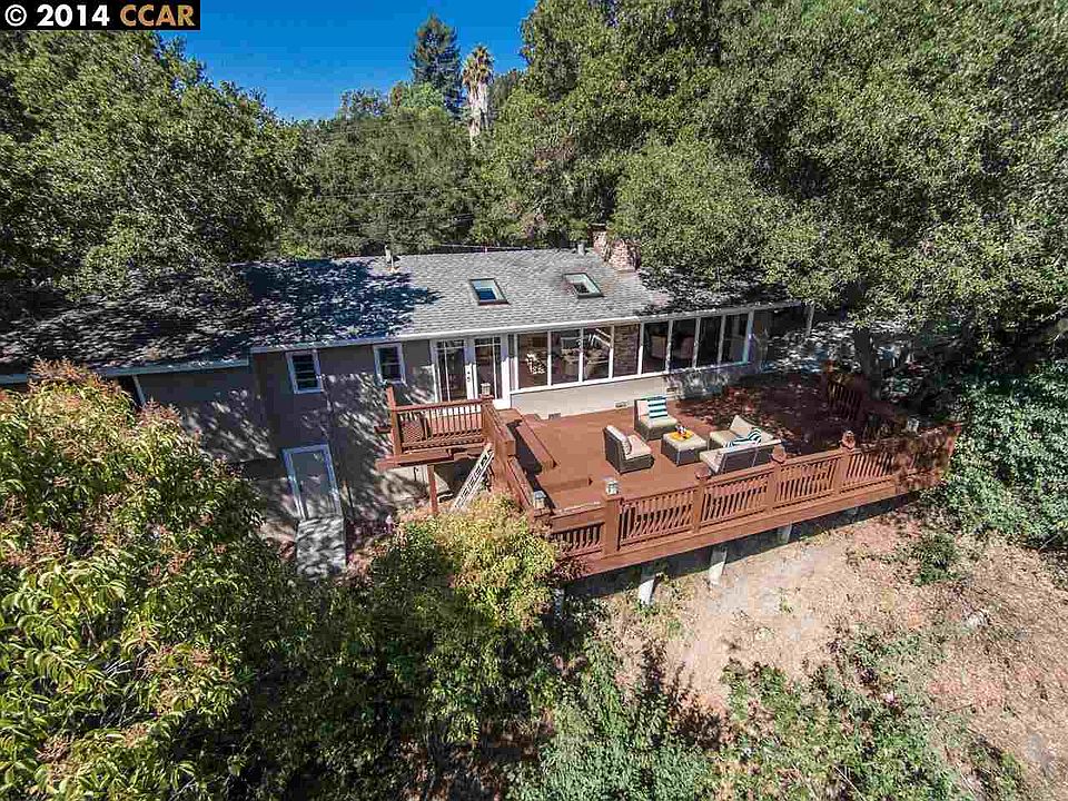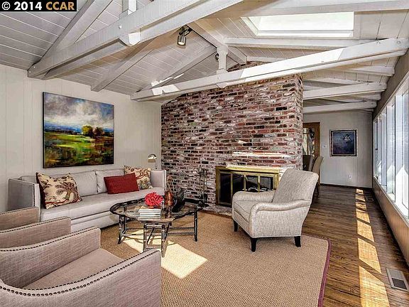 Charming mid-century rancher with tranquil wooded vista. The cozy vaulted ceiling living and dining rooms with hardwood floors and brick fireplace has walls of glass overlooking spacious deck. Perfect for entertaining. Large rec rm/office/bonus rm below add extra living space. Convenient to BART.