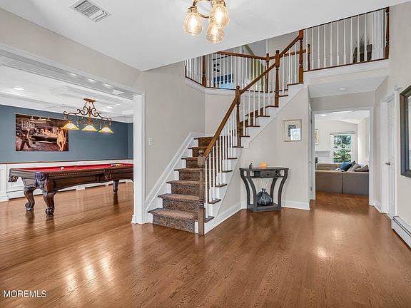 Beautiful wainscoting on much of the first level. Center hall colonial with large billiard room with coffered ceiling, perfect for hosting. French glass doors that lead to your dining room. Sunken family room has wood burning fireplace. New White shaker kitchen with white quartz countertop and stainless steel appliances. Extra large farmhouse sink, center island and wine refrigerator is a great addition for entertaining. First floor features an office or playroom. Beautiful wood stairs with runner that lead upstairs to your 4 bedrooms. Chandelier on a lift for easy cleaning and maintenance. Large primary with walk in closet, with organization system, sitting room and 2 more additional closets. Ensuite has new white bathroom with double sinks. Glass shower is oversized with bench and niche. Three more nicely sized bedrooms with a full bathroom for convenience and privacy.
