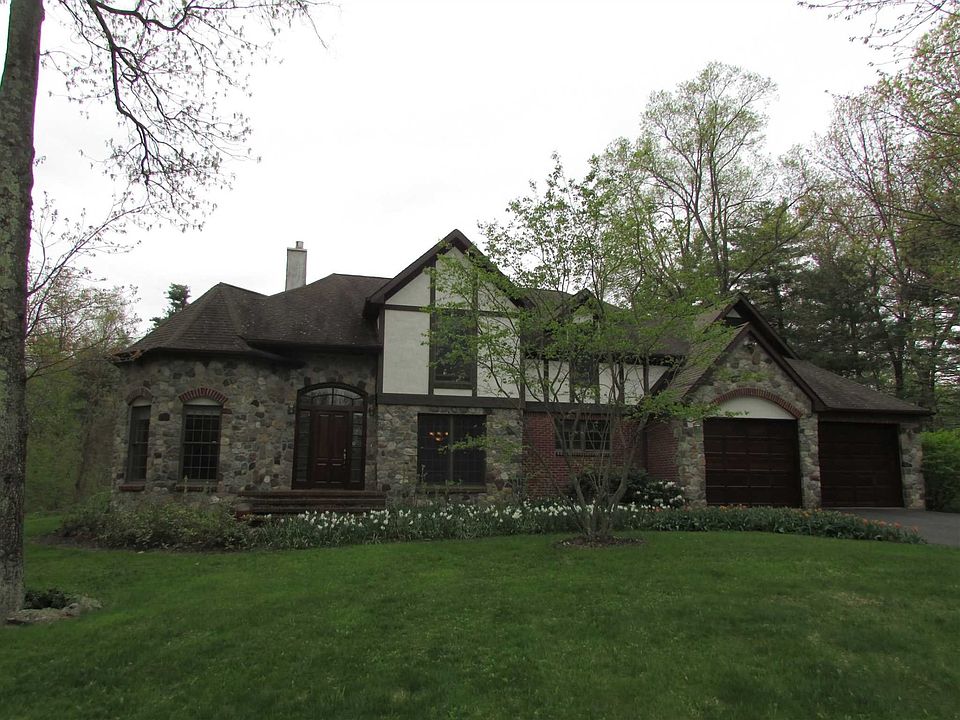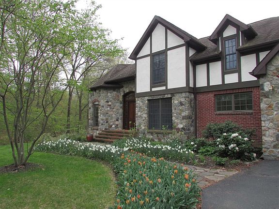 Distinctive stone, brick and stucco Tudor home with great curb appeal in sought-after Rhinebeck area. Situated in lovely neighborhood at the end of the cul-de-sac on 5.5 acres, this elegant home is an architectural gem. Enter into grand entry foyer to impressive curved staircase and open appealing design. The cozy octagonal living room features hardwood flooring with mahogany inlaid design and fireplace. Spacious family room with wood floors, fireplace, vaulted ceiling and attractive stacked windows on built-bay wall. Enormous kitchen offering plenty maple cabinetry, granite counterspace, center island and breakfast nook. First floor master bedroom en suite with french doors leading to private patio. Fabulous backyard with complete privacy. Geothermal heating and cooling = minimal utility costs. Generator hook up too. Popular Rhinebeck and Red Hook village shopping nearby along numerous local things to do including the Hudson River, parks, restaurants and so much more.
