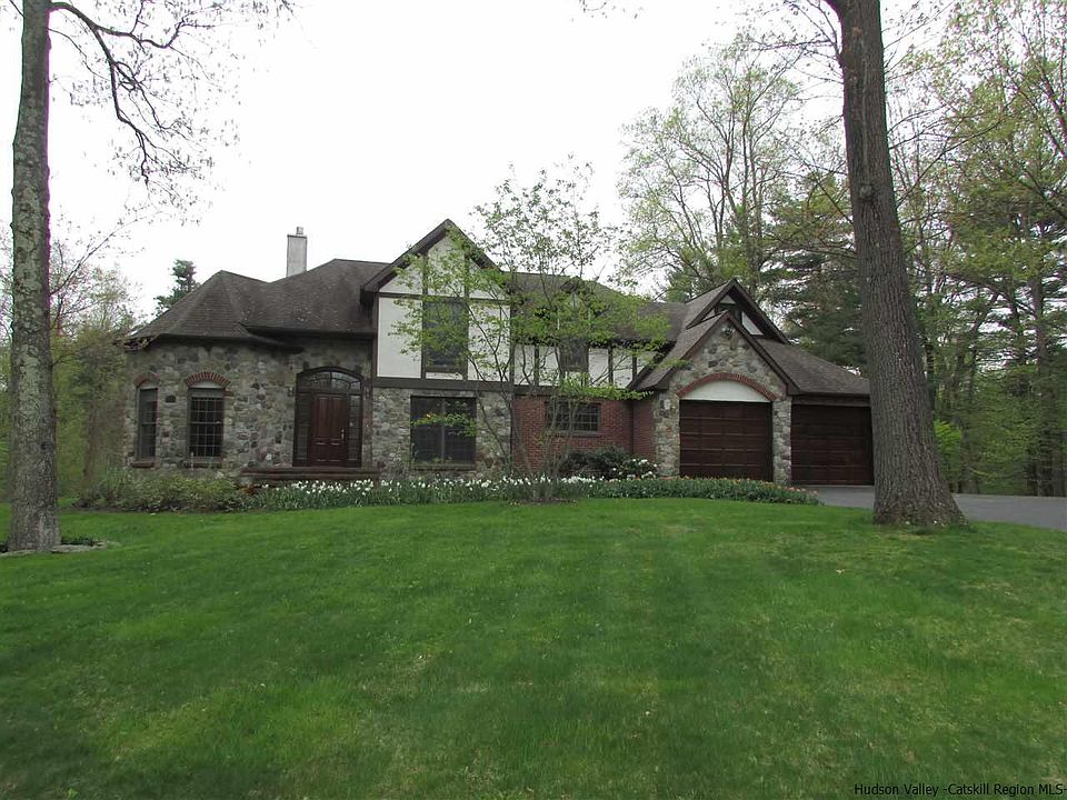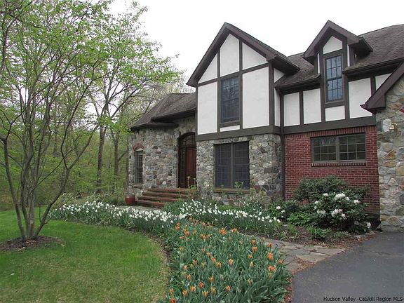 Remarks Distinctive stone, brick and stucco Tudor home with great curb appeal in sought-after Rhinebeck area. Situated in lovely neighborhood at the end of the cul-de-sac on 5.5 acres, this elegant home is an architectural gem. Enter into grand entry foyer to impressive curved staircase and open appealing design. The cozy octagonal living room features hardwood flooring with mahogany inlaid design and fireplace. Spacious family room with wood floors, fireplace, vaulted ceiling and attractive stacked windows on built-bay wall. Enormous kitchen offering plenty maple cabinetry, granite counter space, center island and breakfast nook. First floor master bedroom en suite with french doors leading to private patio. Fabulous backyard with complete privacy. Geothermal heating and cooling = minimal utility costs. Generator hook up too. Popular Rhinebeck and Red Hook village shopping nearby along numerous local things to do including the Hudson River, parks, restaurants and so much more.