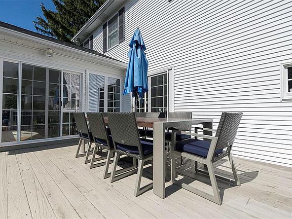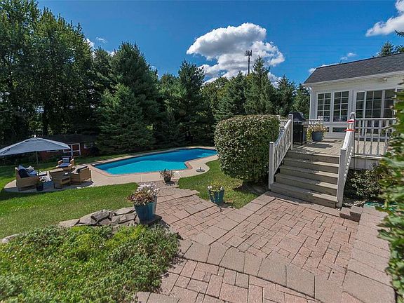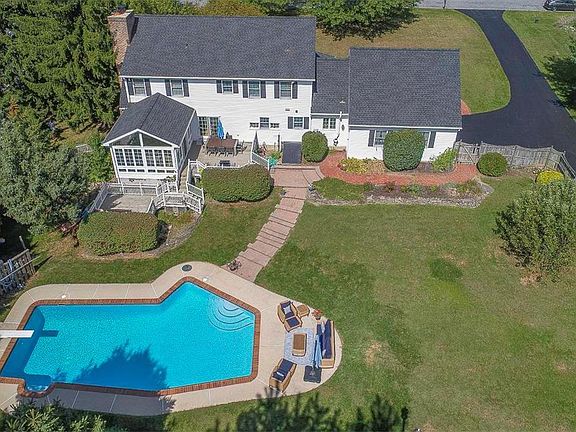 Gorgeous southern exposure colonial cape w/wrap-around front porch in fabulous location! The center foyer greets you w/ flagstone floor & is flanked by a classic living room/den with French doors & custom moldings to the right & a spacious formal dining room w/oak floors, chair rail & French pocket doors to the left. The huge country kitchen offers butcher block island, custom maple cabinets, Corian countertops, new glass cooktop, double wall ovens, disposal & s/s dishwasher & refrigerator. Open concept sunny breakfast nook w/sliding door to deck, family room with wide oak floors & wood-burning FP. Step into the heart of relaxation with a captivating 3-season sunroom, where every moment is a tranquil escape. Whether you're sipping morning coffee or reading a book, this sun-drenched space offers the perfect setting. Also on the 1st floor, you will find a nice-sized laundry room w/sink & laundry chute & an updated 1/2 bath. The 2nd floor offers a beautiful master suite w/wood-burning FP, hickory floors, & a huge bath w/double sinks, shower stall, jetted tub & water closet. There are 3 add'l bedrooms, full bath & a large bonus room also on the 2nd floor. Basement offers a rec. room & craft/play area. Outside, you will discover your personal private retreat— in-ground concrete pool surrounded by verdant greenery & spacious concrete patio, offering a serene setting for relaxation & entertainment alike. 2-tier deck/paver patio & walkways, new wood fence & more! Come & take a look!