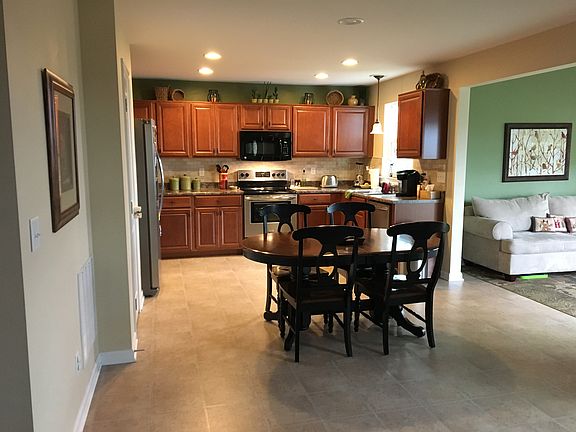 Get ready to call 10 Scooter Ln. Home! Spacious front foyer with guest closet & mudroom from the attached two car garage. Open floor plan, kitchen with upgraded maple cabinets, tile backsplash, stove, microwave, dishwasher & disposal. Family room with gas fireplace, morning room w/vaulted ceiling w/fan and sliding door to a beautiful stamped concrete patio with kohler awning and fully fenced yard overlooking a pond. The 2nd floor offers three bedrooms, the large master has a full bath and walk-in closet, and the 2nd floor is complete with a convenient laundry room. The full basement features a wonderful play/rec room with Rubber Multi-colored floor for kids (can easily be removed) and lots of storage. The home has window blinds thruought, AC, nice landscaping & great location!