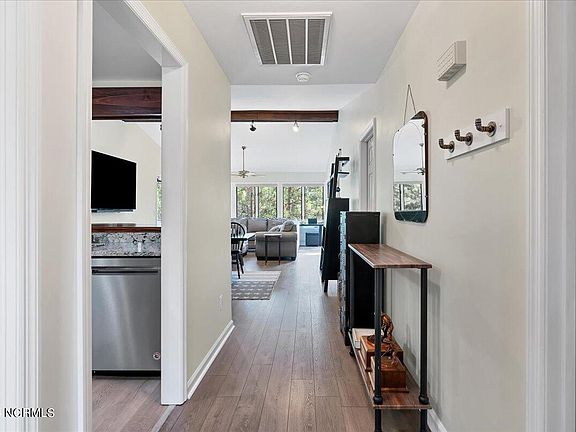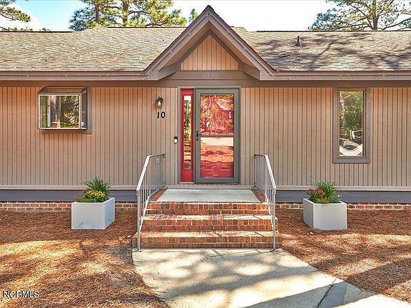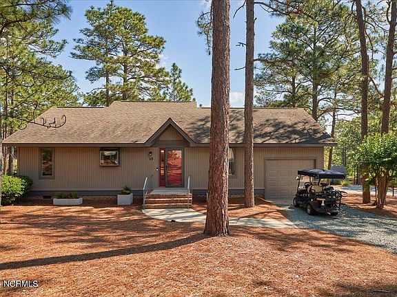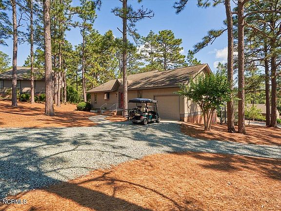This spacious, freestanding townhome offers 2 ensuite bedroom/ bathrooms. Situated on quiet cul-de-sac, opposite the 11th fairway of Pinehurst #6. Bright, open floor plan with beamed vaulted ceilings and recently remodeled kitchen and bathrooms. The kitchen has newer appliances with a solid wood custom breakfast bar which opens to the living and dining areas. Expansive rear deck with private views, and plenty of space to lounge, grill and dine. 1 car garage and 20 amp hookup for your golf cart. Functional split plan townhome with central living/dining space. Pinehurst #6 is golf cart accessible to the historical Village of Pinehurst, shops, boutiques, restaurants. Juniper Creek townhomes offer one of the largest 2 bedroom floor plans in Pinehurst. HOA Management by CAS, monthly dues of $225 include most exterior including roof, common grounds, and termite protection. This property is also available to rent for the week of the US OPEN ($10,500)- contact listing agent for an unique opportunity to 'try before you buy.' Ring security doorbell camera will convey, and red outdoor umbrella is available for purchase.