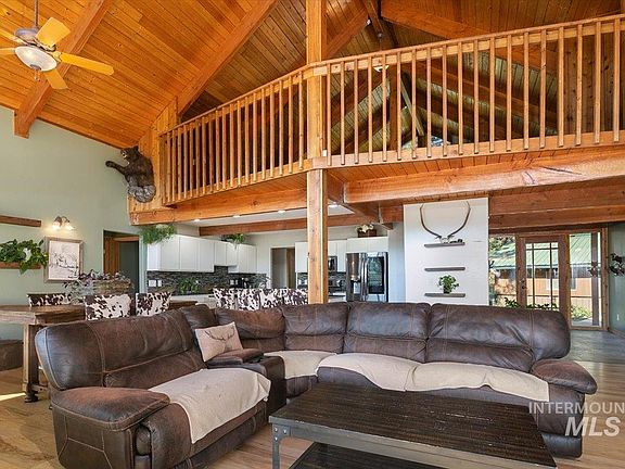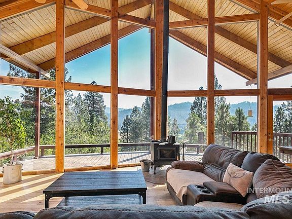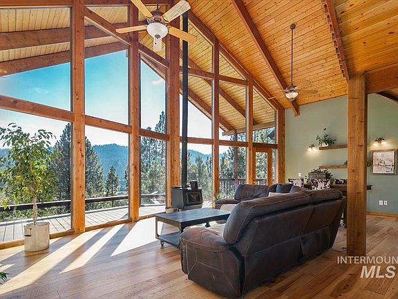 Gorgeous Garden Valley property on 2 acres with stunning views, plenty of privacy and modern amenities you'll love. A beautiful stone entryway greets you but the real show stopper is the tongue and groove ceiling and soaring windows in the great room. Cozy wood burning stove and rich wood floors. Updated kitchen with breakfast bar, granite and stainless appliances. 3 main level bedrooms including the primary suite which is spacious and offers a private balcony and bathroom complete with soaker tub, walk-in shower and tons of natural light. Private den is set apart from the bedrooms proving an ideal "work from home" space. The second level offers a HUGE loft space with vaulted ceilings and views out the incredible windows. Additional bunk room and a bathroom on the second level make it a great space for guests, playroom or additional lodging. The basement is a blank slate and a perfect spot for a game room! Huge wooden deck, lush landscaping, detached garage + shop + carport. No detail was spared in this home.