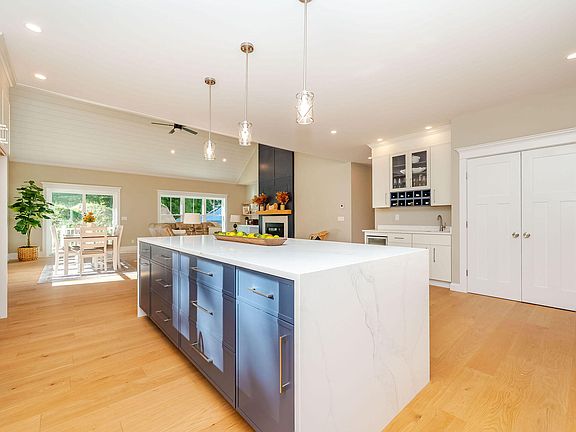 At the center of the home, the gourmet kitchen showcases quartz waterfall counters, a wet bar, an expansive island for entertaining, and an impressive pantry. Just off the kitchen, the great room features soaring nickel gap cathedral ceilings, a remarkable gas fireplace and mantel, with a slider leading to a large deck overlooking the backyard.