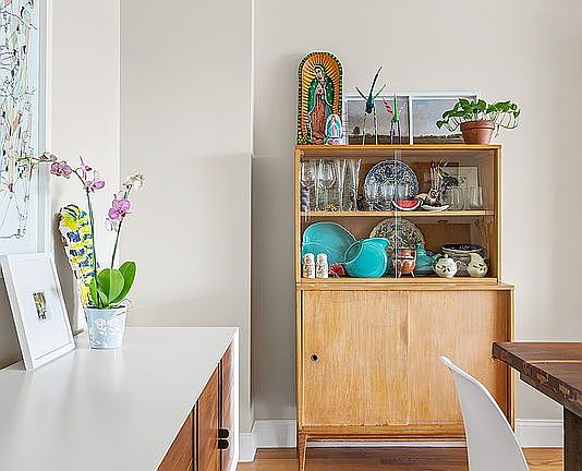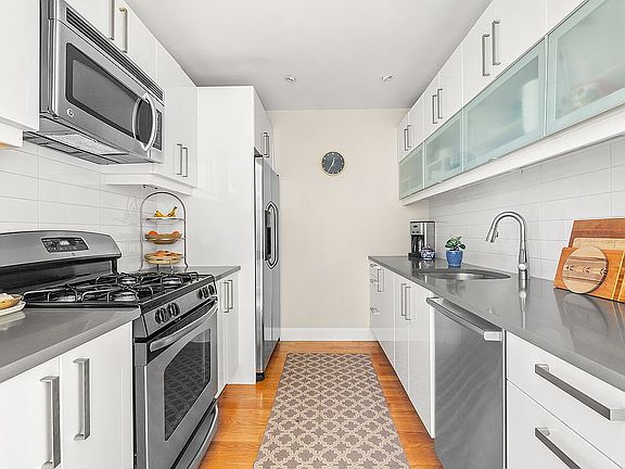 The home begins with a welcoming entry space with a convenient coat closet and full bathroom. A 22-foot-long living and dining room features a huge window that lets in an abundance of natural light. Roomy and sleek, the galley-style kitchen is equipped with stone countertops, white tile backsplashes, custom white lacquer cabinets with countertop lighting, a USB charge port, and a suite of stainless steel appliances from GE and Bosch.