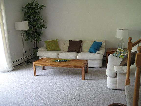 Available on a partially furnished basis. PLEASE READ this entire section before responding. Whenever anyone enters the grounds of this 5 Unit townhouse building they say "it's so beautiful here." 29 wooded acres and sweeping lawns are outside this building nestled in the woods, accessed by a long driveway. Our property is located immediately adjacent to the Holliston bike trail, and has its own walking trails. This is a 1,167 sf townhouse unit, plus full basement, available for a 6 month lease, with renewal possibility. The townhouse unit offered is carpeted throughout, and has a front deck and a back patio. A 1-bay garage comes with it. The unit has a new efficient heat pump system for heating and cooling, and upgraded insulation. Prospective tenants must have strong financials. Please reply with information on your job and income. I will not respond unless you do so when you inquire, and will not respond to only a request for a tour or application. Owner pays for water, tenant pays all other utilities. Trash removal is provided by the town at the end of the driveway.