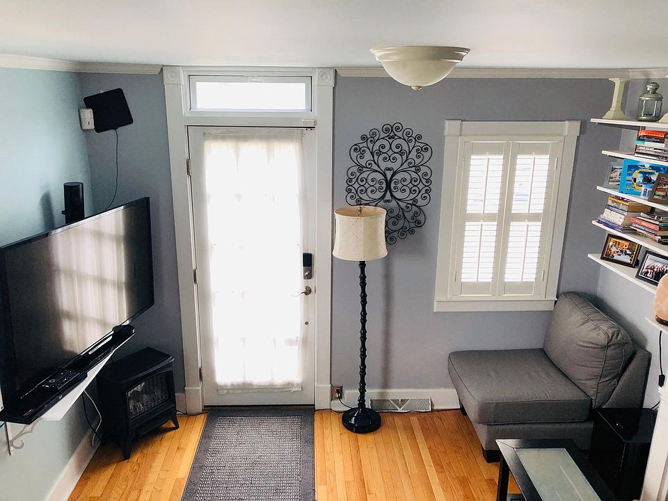 AVAILABLE DECEMBER 1 A fully furnished modernized 2-story 2BR house located in the center of Bordentown city within several min walking distance to the Bordentown beach, Delaware Raritan Canal Towpath cycling and and hiking trail, 5 min walk to pubs, restaurants and shops of Bordentown. A master bedroom has a west-facing window overlooking the backyard. It also has a comfy king-size bed and a spacious closet. The other, office style bedroom has a desk, bookcase and a twin-size bed. Downstairs there's a fully renovated and equipped kitchen with oven, a four-burner gas stove and a wooden island/butcher block. A quaint living room with faux fireplace, professionally decorated. 55-inch TV with Netflix. Fast WiFi. Spacious bathroom w/bathtub with fixed rain shower head. You can also enjoy the sitting area in the beautiful private backyard w/fairy lighting. The house is perfect for working professionals, small families, young couples, friends. Owner pays for water and sewage only. No smoking. No pets. Last month's rent due at signing.