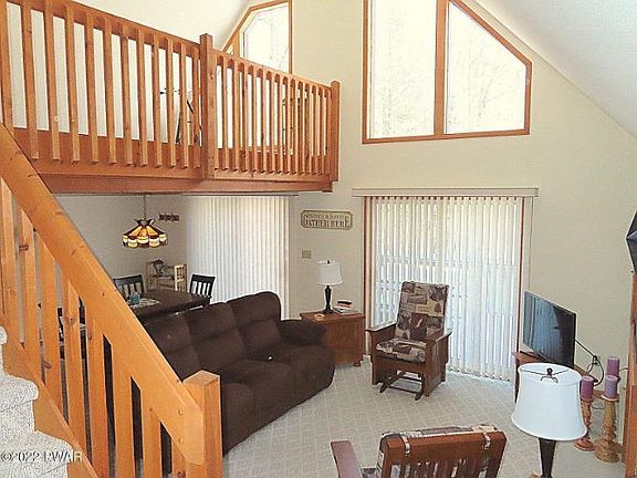 BEST Central CHALET LOCATION - Walk to Pool and playfields, quick golf cart ride to Wallenpaupack water play access, and Wooded Privacy. This home is Like New and Low Maintenance! Hand craftsmanship TnG touches for wood accents to bright Open floor plan, cathedral ceiling with propane Fireplace ; Corian kitchen counter with accented backsplash; 2 Bedrooms an sleeping loft or family room, 2 full baths, entertainment sundeck, a c window units. You'll Love the Very Nature of Indian Rock full amenity lake community. Comes with basic furnishings. DEMAND LOCATION makes for ''FAST'' ACTION A MUST!