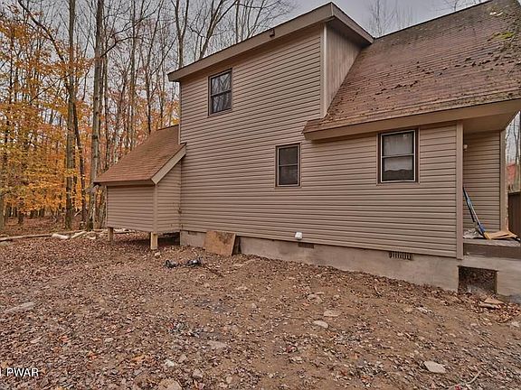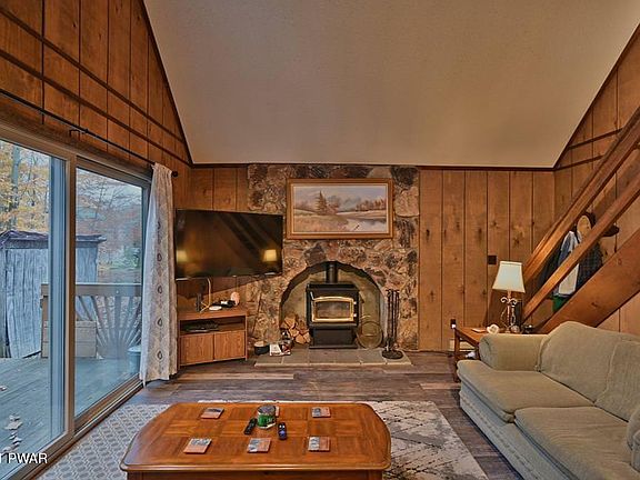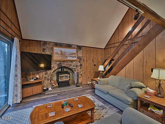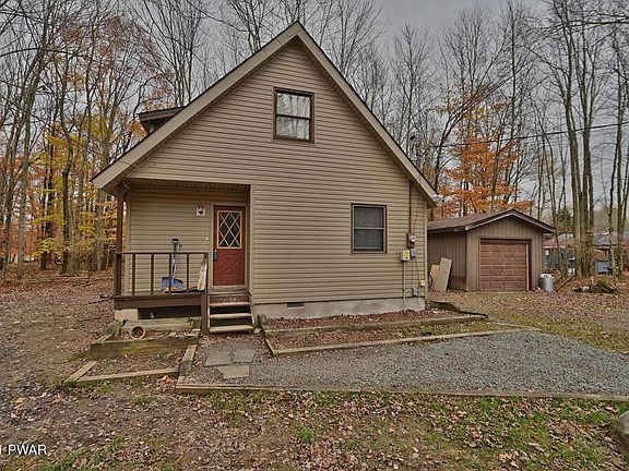 This chalet is located on a private cul-de-sac in a four season amenity filled community in The Northern Poconos, just two hours from the NYC and Philadelphia areas. Nestled in the woods on a level lot, this home is the perfect getaway. It comes with a one car detached garage and has a rear deck. The inside has new Lifeproof vinyl plank flooring in the main living area, a new kitchen, a breakfast nook, woodstove with surrounded by stone, 2 bedrooms plus a loft overlooking the living room that can be used as 3rd sleeping space. The amenities include lakes, beaches, pools, clubhouse with restaurant and pub, golf course, ski hill, tennis, indoor recreation complex with tennis/fitness center/arcade and more! ball fields, children's playground, miniature golf, walking trails, arts and crafts, a great recreation program including day camp for kids, campground, 24 hour security, gated access, must have an appointment with an agent to tour the community.