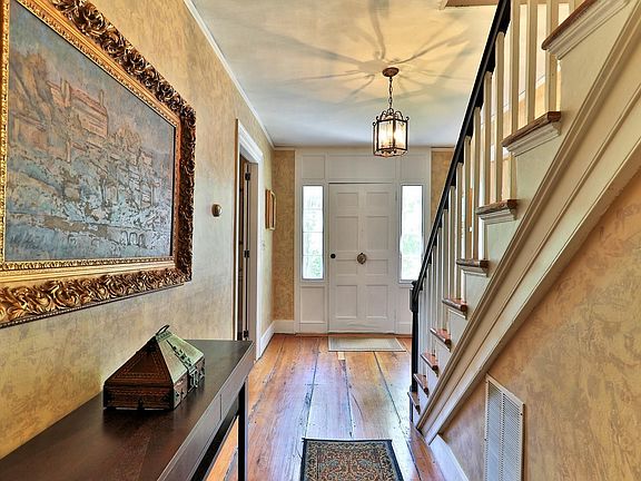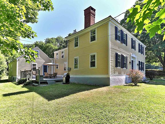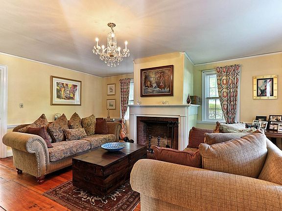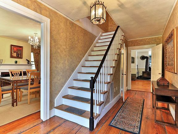This well-maintained federal home in a quiet, established neighborhood built in 1802 by Eliot Lyndes has retained it's original architectural and structural style. A childhood home of the 22nd Vice President of the U.S., Levi Parsons Morton (1889-1893), the home features original woodwork throughout, wide-planked pine & spruce flooring, gorgeous stencil-painted center hall entrance & staircase, spacious formal living & dining rooms with fireplaces, family room with wood-burning stove & built in cabinets, kitchen features original domed brick oven, pantry, laundry room, powder room & servants staircase. 2nd floor offers a large master suite with fireplace, 2 large hallway-lined closets & master bath with separate twin vanities, guest en suite bedroom with fireplace & 2nd guest bedroom. The original traditional English barn & hay loft adjoins at the back of the home & has been converted to additional living space. Lower floor offers 2 large rooms that can be used as additional bedrooms or offices (currently used as offices), a full bath, and a small library/reading room. The upstairs area features an amazing Colombage loft area providing the perfect spot for additional guest quarters or cozy den. A deck off the kitchen provides lots of privacy to enjoy breakfast or a relaxing dinner. The detached 2-car garage has an additional finished space currently being used as a fitness room. If you love the history and charm of older homes, then you must see this beauty.