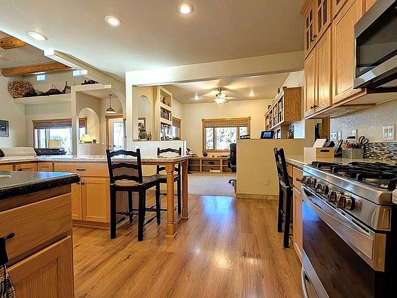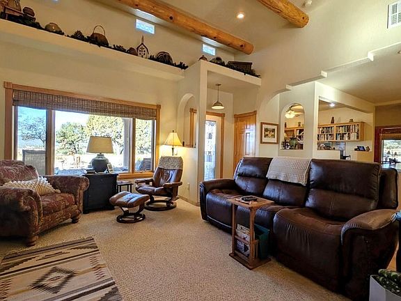 Feels like top of the world at this strategically planned, western facing Santa Fe style home, with window views in all 4 directions. Perfectly situated on a hill just a few minutes from downtown, yet offering a great level of privacy. Step outside onto a spacious outdoor patio, already transformed into your own tranquil sanctuary and/or entertaining/bbq space with gas plumbed grill. Inside, the kitchen is a chef's dream, with ample storage for all your culinary equipment, keeping things organized and clutter-free. This southwest style home features beamed vaulted ceilings, storage galore, refrigerated air, double pane windows, ceiling fans throughout and custom roman shades. The large primary bedroom and bath feature a large walk-in closet and the 2 bedrooms boast oversized closets. Adventure in the Gila National Forest with phenomenal hiking/biking trails is just moments away. Silver City is a destination to explore the beauty of nature and breathtaking scenery.