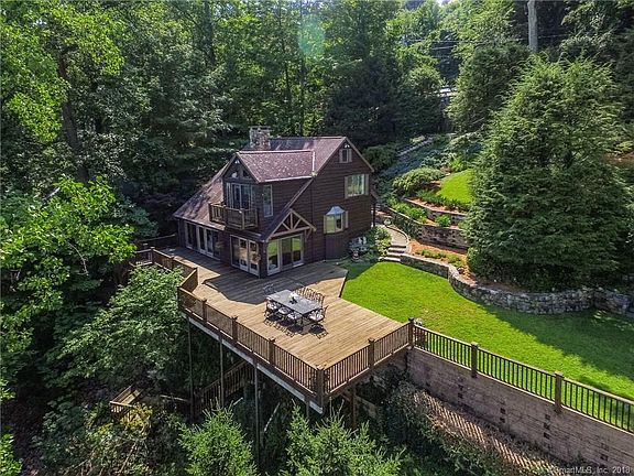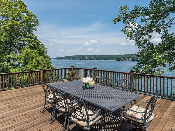 Enchanting Candlewood lakefront property. Spectacular panoramic lake views with 93 ft of lake frontage and gracious deck for entertaining. This majestic home is nestled on the hillside offering an abundance of privacy with landscaped perennial gardens and extensive custom stonework. This lodge styled home comes with dramatic features such as vaulted ceilings, custom stone fireplace, wide-plank hardwood floors, corner sunroom and wet bar. Many decorative luxuries including terracotta floor tiles from France, limestone hand painted tiles from Portugal in baths and kitchen. The Kitchen is First Class with amenities such as a custom millwork with vintage pulls, gas Viking stove, Subzero refrigerator & Miele dishwasher. The master bedroom includes a juliette balcony with breathtaking view, architectural triangular window with adjacent luxurious master bathroom. Additional spacious bedrooms with ample closet space. The exterior charm includes french doors, bay windows, expansive sliding doors, sprawling deck and cabin siding in the vernacular of the area. Additional features include full security alarm system, intercom system and sprinkler system. Additional access to the home includes a remarkable steel tram for super convenience. Rare opportunity to own tranquil lakefront in Candlewood Isle where you can enjoy the Clubhouse, beach, tennis, bocce ball, basketball, summer youth and senior recreations, secured guard house, boat mooring and bulkhead for buyers future private dock!