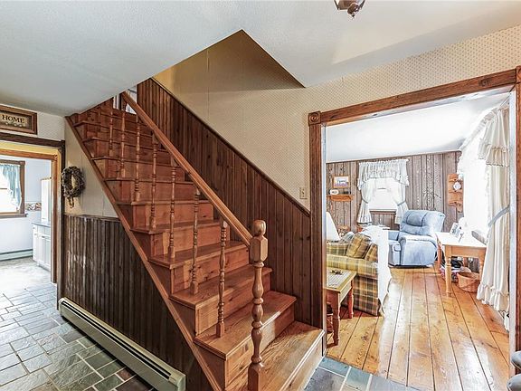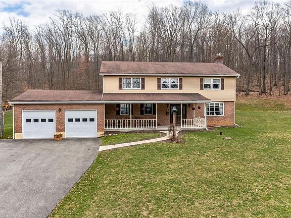 This stunning residence stands as a testament to refined living and thoughtful design. As you enter, a slate foyer welcomes you, setting the tone for the elegance that awaits. The main living areas boast exquisite pegged, handmade wood floors, each plank bearing the history of trees from the property itself. The family room beckons has a stone fireplace with hearth and a bow window invites in natural light. The kitchen is a culinary haven equipped with every modern convenience. Solid wood cabinets with a pantry with pull-out shelves provide ample storage, an island offers both workspace and casual dining. Double oven and a five-burner cooktop complete the area. A laundry room, mud room and full bath complete the first floor. The main bedroom offers privacy complete with a full bath & a cozy sitting area. Three additional bedrooms & another full bath ensure ample space for family and guests. Downstairs you'll discover a finished basement featuring a stone wet bar & several sets of Dutch doors. The property itself is a masterpiece of natural beauty, with a large open area bordered by majestic trees. A private drive leads to the home. A separate out-building with its' own basement, electric, and heat—currently used as a wood shop adds to the home. Two additional sheds offer even more storage space. The home is being sold with additional parcel #59-5492-02-75-7699, Acreage listed is the total of both parcels.