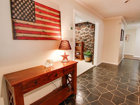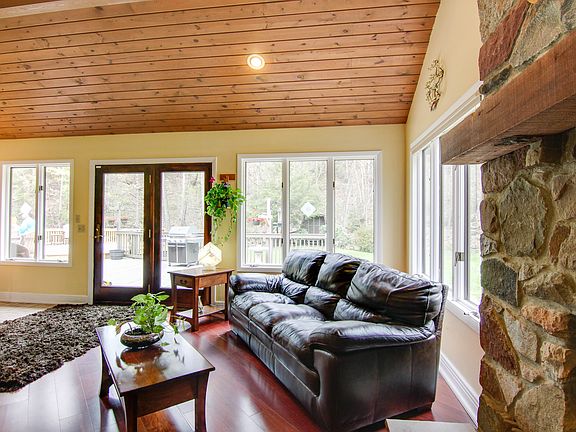 Elegant contemporary Ranch on 3.5-acres of tranquility offers one of kind lifestyle. Upon arrival one is surrounded by picturesque rocks, bridges, streams & waterfalls all of which add natural beauty to this exclusive 4-BR home. LV is filled w/natural light & boasts cathedral ceiling, 2 story remote start gas FP & Brazilian hw fl. DR has crown molding & frosted closets. Lg eat-in KT would be any chefâs delight featuring an abundance of cabinetry & counter-tops Foyer leads to breathtaking sunken FM w/sprawling cherry hw fl, custom built-ins, cathedral ceiling w/recessed lighting & striking center stage wood burning FP that creates a welcoming oasis. 4 well-appointed BRs ea w/generous closet space. 2 full baths-1 w/sunken soaking tub, sliding doors that provide forest view & leads to private deck. Master boasts stone remote start gas FP & sliding doors that lead to SR. UL loft w/skylights, custom seat window, secret room & massive walk-in attic. ML 1/2BA, 2 car garage, lg deck & hot tub.