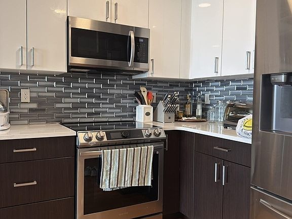 Modern fixturesGlass-enclosed walk-in showerGleaming hardwood floorsGenerously sized bedroomStylish white shaker cabinetsAmple closet spaceNewer stainless-steel smart appliances