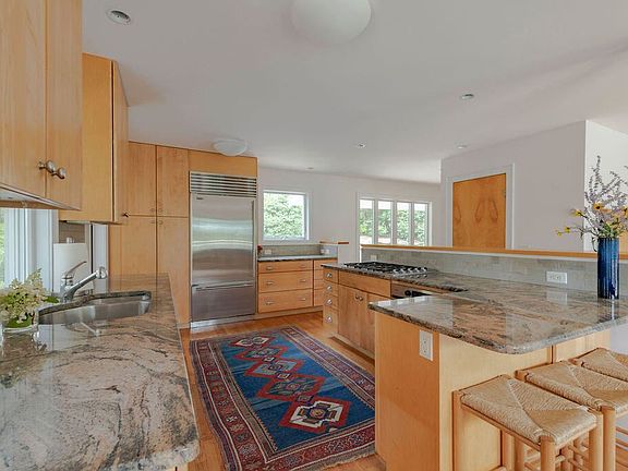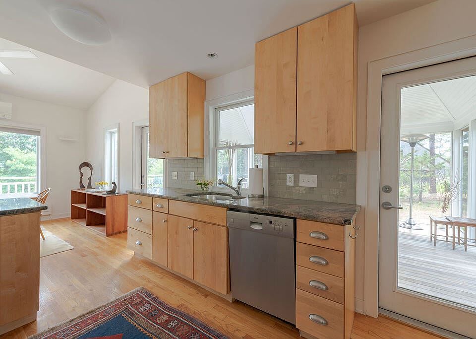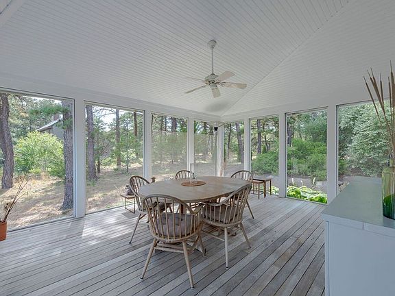 Bathed in sunlight, adjacent to conservation land. Architecturally-designed contemporary home is a perfect peaceful retreat, yet steps to downtown Wellfleet. Breezy, easy feeling to this sliceof paradise. Included in the price is an adjacent, buildable 4 bedroom land parcel. Enter to tiled foyer, oversized windows, gleaming light-colored hardwood floors; kitchen on the right with all the amenities, sub-zero refrigerator, 5 burner propane stove, granite counters, breakfast bar. Screened porch equipped with clear vinyl panels that roll up for the summer, down for the fall and spring. Cathedral ceilings soar above dining area open to kitchen and sitting room creating a perfect flow. Sliding glass doors to large private deck. Care and attention to design & details are evident here. Main floor bedroom w full bath; walk-in closet, built in desks, adaybed. Sliders to deck and steps to the outside shower. Upstairs: two bedrooms, 2 full baths (one is ensuite) Half stairway to upper level smaller deck, star-gazing? bird watching? Relaxing? Walk out ground floor level with spacious sitting room, wet bar, 4th b/r w full bath. Hot-tub/patio area. Garage & Generator. Just Stunning!