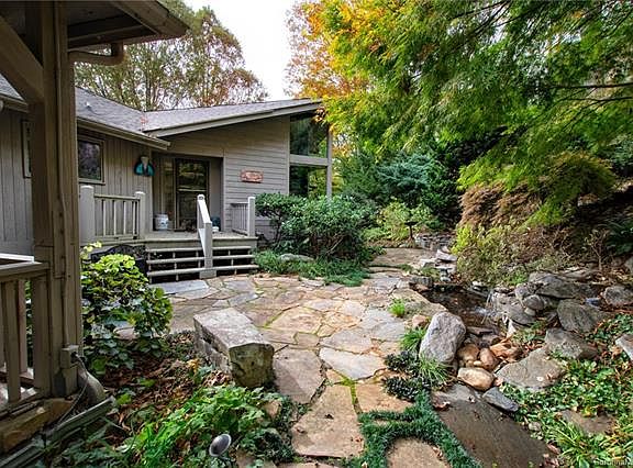 Stunning contemporary retreat with views and an in-law suite nestled at the end of a beautiful cove only 20 minutes from Downtown Asheville! Extensive edible gardens; enjoy friendly neighbors, sunsets and nearby trails. Inviting entry opens to a spacious living room featuring a cathedral ceiling, exposed beams and floor-to-ceiling windows with panoramic views. Spacious floor plan features 3 beds and 3 baths in two separate living areas. Main level includes master suite and 2nd bedroom. Daylight basement includes bedroom, kitchen, living and laundry with a separate entrance. Outdoor living from every part of the home including a private patio from the in-law suite and a spacious stone gazebo perfect for parties. Endless gardens form a permaculture paradise that has been featured in the Wall Street Journal and several Carolina magazines. Outdoor fire pit, stone terraces, pond, babbling brook, seating areas and stone pathways ready to meander with a cup of coffee or a glass of wine.