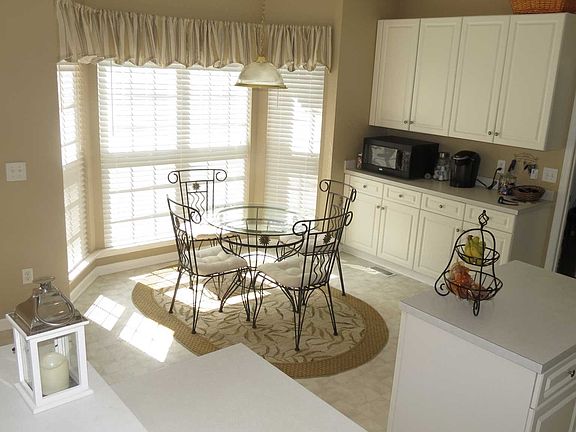 - Kitchen: Bar, Cabinets-Wood-White, Counter Tops-Formica, Eat In, Island, Vinyl Floor, Bay Window