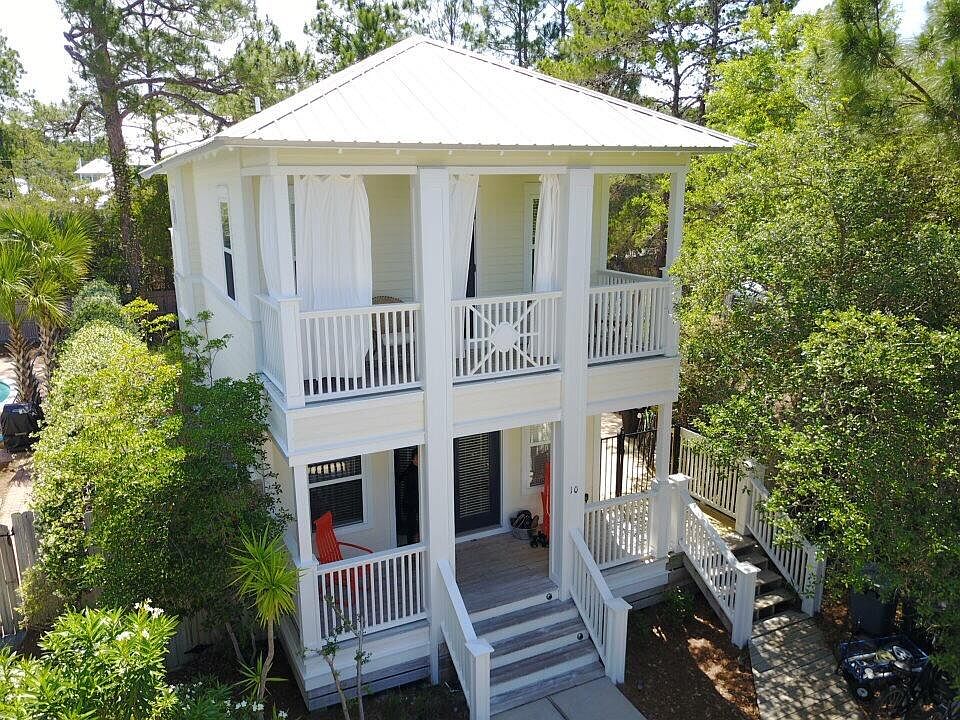 This coastal cottage is ideally situated south of Scenic Highway 30A within a quiet community and is the idyllic coastal retreat. A backyard oasis with private heated pool exceptionally provides for the Florida coastal lifestyle. Offered fully furnished with a well-designed layout, this home features an inviting open floor plan with shiplap accent walls that seamlessly integrates the living, dining, and kitchen areas. The kitchen showcases new cabinets and floating shelves, quartz countertops, high end stainless-steel appliances and refined lighting fixtures. With indoor seating for 5 at the dining table and an additional 3 at the kitchen island, hosting gatherings is effortless. Wood flooring throughout the home is complemented by marble tile in the bathrooms. Two bedrooms occupy the second level - a spacious primary bedroom featuring a cathedral ceiling which boasts ample light and opens to a private balcony. The primary bathroom offers a marble double vanity and a walk-in shower with marble tiling. The guest bedroom with a private rear balcony includes a well-appointed guest bathroom. Conveniently located on the first floor is a versatile bedroom and a full bathroom which also serves as the homes powder room and provides ample space for guests. The first floor of the home is designed for gathering, dining and preparing meals and seamlessly flows out onto the outdoor spaces for grilling and gathering in the enormous back yard with swimming pool. Positioned on an expansive corner lot, the backyard lends itself to Florida lifestyle living and is a major feature of this coastal home which features a large deck area adjoining the large pool deck area with a custom fire pit. The heated salt water pool with outdoor shower amongst the live oak trees consummate the lifestyle experience of this Florida beach cottage. The backyard space tastefully incorporates a storage shed built to match the home and a greenhouse for your flowers and vegetables. This home has been maintained impeccably and features a high efficiency variable speed Carrier HVAC system with total home air filtration.