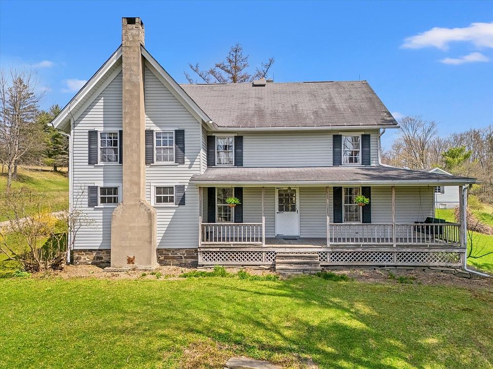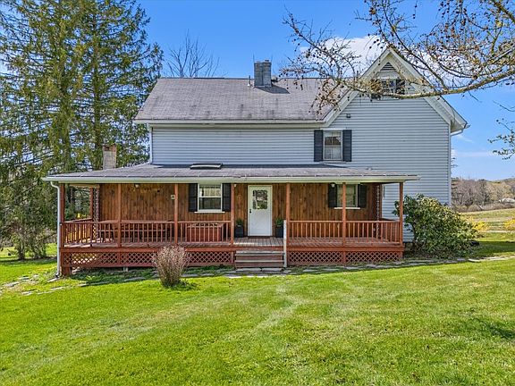 Don’t miss this exceptional chance to own an 80 acre property that’s been family-owned since 1855! The land spans three joined parcels and includes open fields, fenced pasture, woods (including hardwoods), a former Christmas tree grove and a pond. The stately 4 bedroom, 3 bath farmhouse, built in 1879, exudes timeless character and charm, from front and back porches, hand-hewn beams, antique lighting, original barnwood floors, & handpicked fieldstone accents. A 4-car garage with a grease pit and stairs to an attic features a separate 5th bay for office space, storage, and a fruit cellar. A 3-story, 7500 sq ft barn with a new metal roof installed in 2021, offers 7 box stalls and a large free stall on the ground level. The main level has a built-in ladder to the hay lofts above as well as an electric hay elevator. An 1800 sq ft machine shed serves as the hub for farm equipment. There is also an 800 sq ft multi-level granary last used as an antique shop and a finished chicken coop
