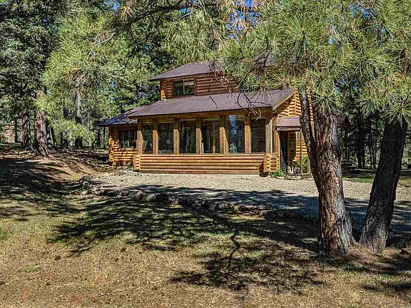 This is your log cabin in the woods. 2 bedroom 2 bath with ample living room and kitchen/dining plus laundry room. Two bedrooms on the second floor with one bathroom. Set amongst mature pines with a flat easy access drive. About a mile off the main Hwy with a feel of seclusion. This subdivision is small but only 6 miles to the center of Angel Fire where you can enjoy golfing and skiing and all that Angel Fire has to offer. The cabin has a cozy feel with log interior/exterior and wood flooring. Comes mostly furnished. Great outdoor campfire area and outdoor shed with extra wood shed. Approx 2.3 acres of thinned forest. Close access to Hwy 76 and State Land.