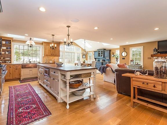 Not your typical Colonial! Expansive 5 bd, 4.5 bath home set back on a large fenced lot, w/ barn, offering 1st floor options of live-in quarters, guest suite or home office w/ separate entrance, kitchen, laundry, full bath, bedroom & deck. From the front farmers porch imagine relaxing on a wood swing or rocking chairs in the warmer weather. Enter the foyer into a beautiful, spacious, bright & open kitchen, dining & living area w/ wide oak floors, wet bar w/bev cooler, built in window seats & stone fireplace perfect for entertaining. Impressive kitchen features high-end Wolf & Subzero appliances + 10' Spekva wood island & walk in pantry. Plenty of space to spread out or to be together w/ a combination of large open rooms and cozy, more intimate rooms. Finished basement w/ theater ready media/playroom w/ sauna & full bath. Deep 20X50 garage provides storage or space to park a boat. Upstairs areas feat. laundry rm + 4 bedrooms incl. amazing master suite w/ full spa bath & fireplace. Wow!