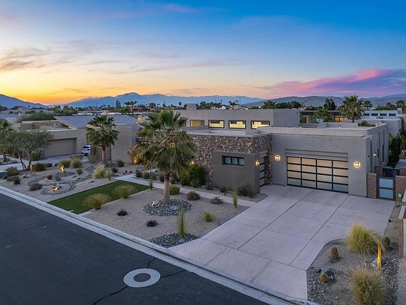 Your ideal desert contemporary home awaits in Rancho Mirage's premier gated neighborhood, Estilo. This beautifully upgraded and highly desired Elan floor plan offers 3 bedrooms, Office / Den, 3.5 bathrooms, a modern great room with stacked stone fireplace, voluminous 16' ceilings, 20' pocket sliding door leading to a covered patio for the ultimate indoor/outdoor living. The modern designed kitchen includes an expansive island, stylish cabinetry, Quartz counters, mosaic backsplash, stainless steel appliances & an adjacent wet bar ideal for entertaining. The versatile bonus room is located next to the guest suites with easy access to the rear patio. The Master Suite has a sliding door to the rear yard, large walk-in closet, dual sinks with vanity & a freestanding tub. The home features state-of-the-art sound system, designer paint scheme, designer window coverings, tile flooring, the upgrade list is endless! There is also a private gated entry courtyard, 3-car garage and ecofriendly landscaping. The current owners have spared no expense creating a modern show home ideal for both daily living and constant entertaining. The rear yard is a private oasis with stunning mountain views, 40' pool, raised spa, fire pit & plenty of sunshine offering the ultimate lifestyle. Estilo offers low HOA dues and is located within the desirable IID district for low cost electric bills. Don't miss out on this modern dream home!