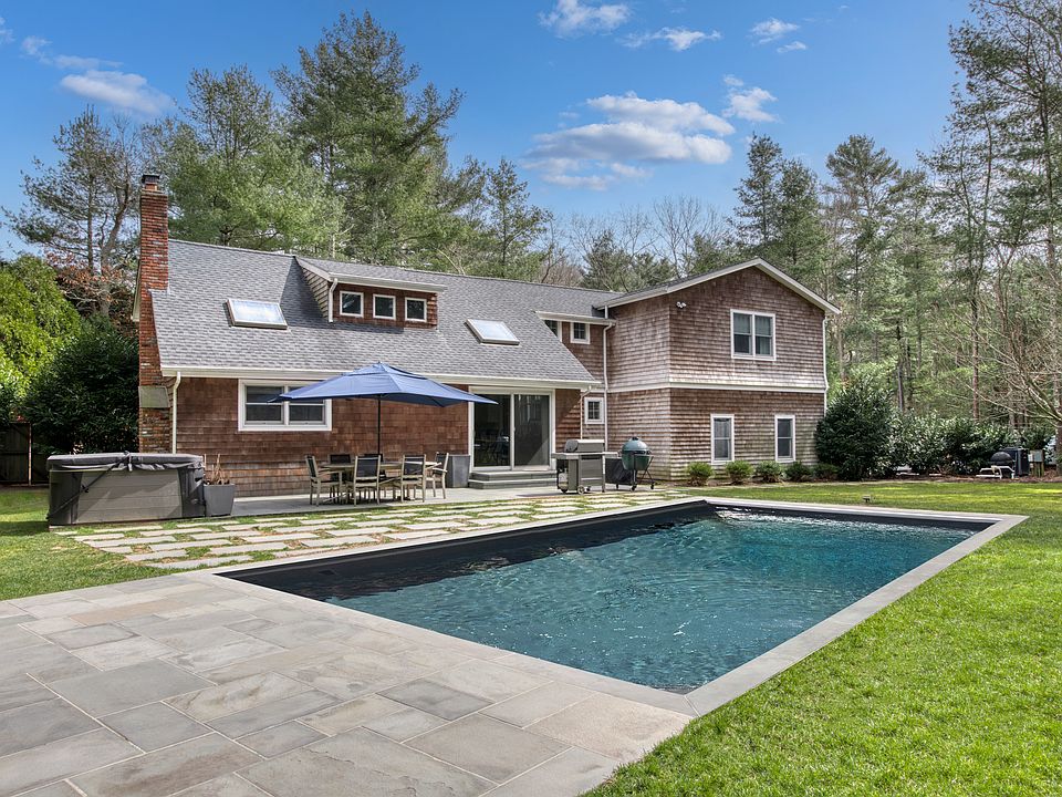 Welcome to 10 Villa Avenue, an exquisite retreat nestled in the heart of East Hampton, NY. This beautifully designed residence offers a harmonious blend of modern elegance and comfort, perfect for those who appreciate quality and style. Step inside to discover a thoughtfully renovated interior featuring three spacious bedrooms and four luxurious bathrooms. The heart of the home is the great room, an inviting space ideal for relaxation and entertainment. The recently updated kitchen is a chef's dream, boasting high-end appliances and tasteful finishes that make cooking a delight. The additional den offers flexibility for a home office or cozy reading nook. The primary suite is a true sanctuary, complete with two expansive walk-in closets and a large en-suite bathroom, providing a private haven for relaxation. The two guest bedrooms each with a dedicated bathroom, are spacious and comfortable. Venture downstairs to the large finished lower level, where a generous recreation room awaits, featuring an impressive 80" television for movie nights or game days. Outdoor enthusiasts will revel in the expansive backyard, complete with a 36x18 heated vinyl pool and separate hot tub perfect for summer enjoyment. The deck is equipped with a grill and smoker, ideal for hosting gatherings, while the recreation area adds a touch of fun and adventure. Experience the best of East Hampton living at 10 Villa Avenue, where every detail has been crafted for your enjoyment and comfort.