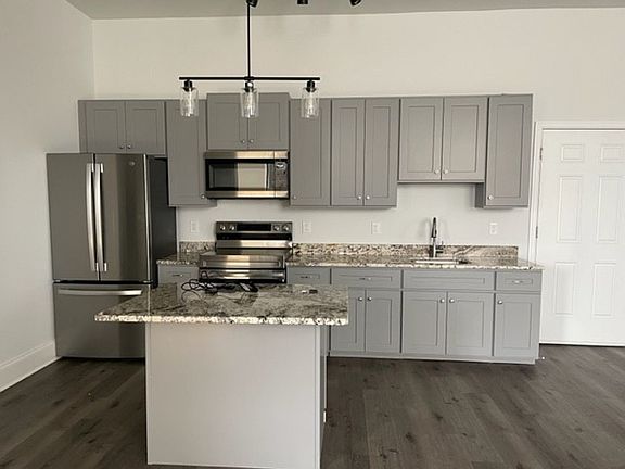Oversized kitchenGranite countersGorgeous gray kitchen cabinetryStainless-steel appliances
