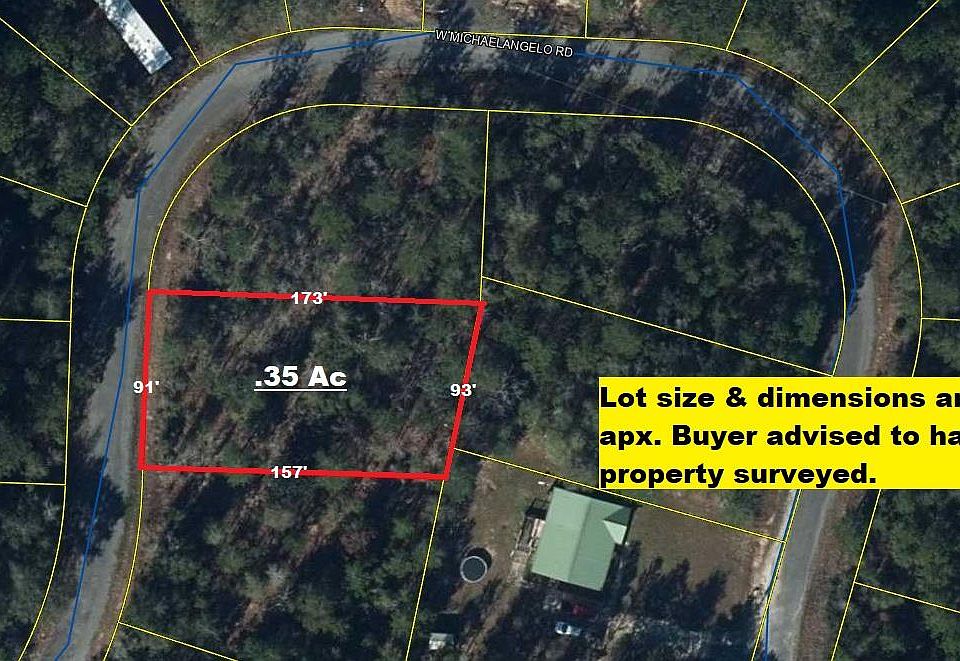 1/3 acre lightly wooded lot off Oakwood Lakes Blvd, on W Michaelangelo Rd. Great location just outside city limits and only minutes to downtown Defuniak Springs. Build your dream home, or have a manufactured or tiny home set up on lot. Electric runs along Michaelangelo Rd. Public water is available, with paid tap fee. Septic tank would be required. Priced to sell...this lot won't last long!