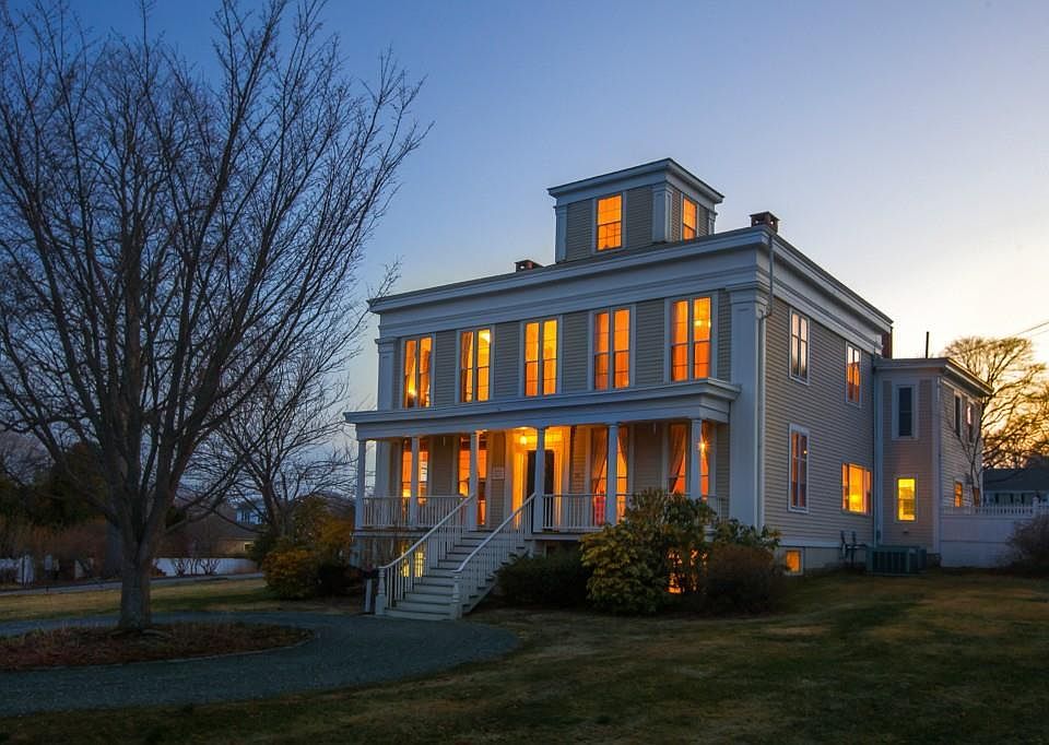 One of Mystic's classic "captain's houses", this Greek Revival home was built for Captain Peter Rowland, who set the speed record for sailing from San Francisco to New York on his clipper ship David Crockett in 1860. Renovated kitchen with S/S appliances (including oversized refrigerator and freezer) and skylights. 10' high ceilings, flexible floor plan on first, and possible in-law or au pair suite on second floor. Third floor is an enclosed widow's watch with water views. Many recent upgrades while preserving the character of the home. New roof, hot water heater, oil tank, renovated 2 story barn plus 2 car garage. Large windows make a bright sunny home, sited on a large corner lot within easy walk of downtown Mystic. Click the Virtual Tour link below and open the interactive floor plans to view pictures.