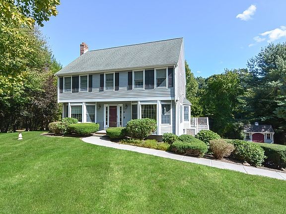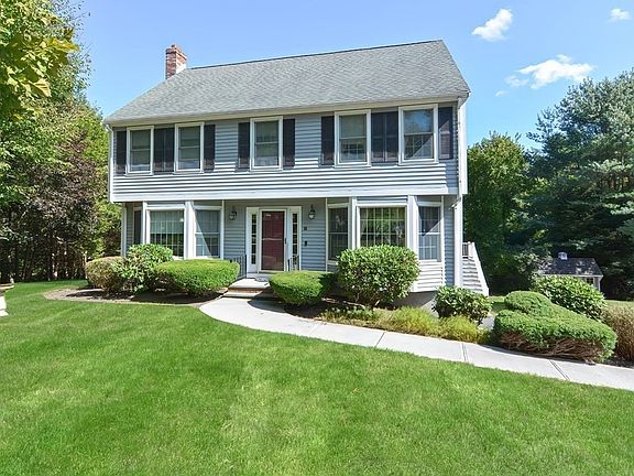 Attractive 9 Room, 4 Bedroom Colonial in desirable neighborhood is situated on a .98 acre beautiful wooded lot. Welcoming Marble Foyer, Formal Living Room and Dining Room feature Hardwood Flooring and large Bay Windows ushering in lots of natural light. The Family Room features a wood burning Fireplace with Brick Hearth, Bay Window and Hardwood Floors. Bright open eat-in Kitchen features SS Appliances and Tiled Flooring with access to a Large Sunroom with vaulted Ceiling and Sky Lights. Enjoy your morning Coffee on the maintenance free Trex Deck or in the Hot Tub overlooking a fabulous private wooded back lot! All 3 bathrooms feature newer Toilets, Vanities and Fixtures. New interior paint 2023 and some new lighting. Central A/C, Irrigation system, First Floor Laundry and Shed. Award Winning School Status, Downtown Shopping, Popular Working Farm and Fitness Center. Close to major highways and ~4 miles to the commuter rail. Don't miss this one!