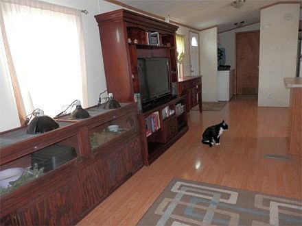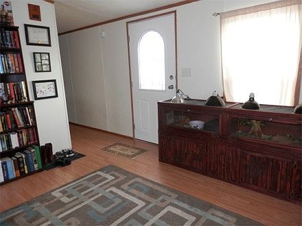 3 bedroom 2 bath newer model offers open floor plan with cathedral ceilings. Centralized kitchen has many cabinets & newer counter tops. All appliances stay. Newer flooring. Master bedroom is separate from others. 10''x10''x10'' shed with overhead storage new in ''10 w/ladder. Paver patio & 2 car driveway perfect for a carport. Hot water htr new in ''10. Mobile is placed on a full concrete slab not runners.