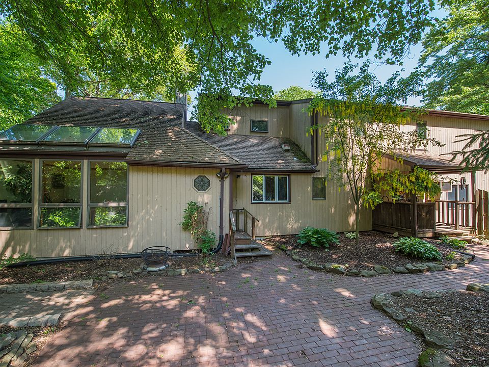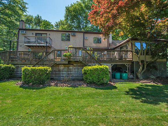 Fayson Lakes 2400+ sf 4BR, 3bath home set on .28AC with 55' deck allows for optimum outdoor entertaining & enjoyment of the lake view. Not your average lakestyle home! The charm of a log cabin meetsmodern delights! MBR with balcony access overlooking lake, 2 walk in closets & full bath with large jetted tub. Skylights t/o the home add natural light. Huge family room with woodburning FPL & wet bar & sliders to deck; LR with fieldstone FPL flow to galley kitchen with breakfast bar. Enjoy the sunny breakfast room/den w/gas "woodstove". Private patio/garden with 6 person hot tub. Formal DR w/ French doors flows to sunroom w/ vaulted ceiling & deck access; BR/Office also on main level & full bath. 2nd level incl 2 add'l BRs, full bath + cedar storage. Impressive yard space! Access to dock across street.