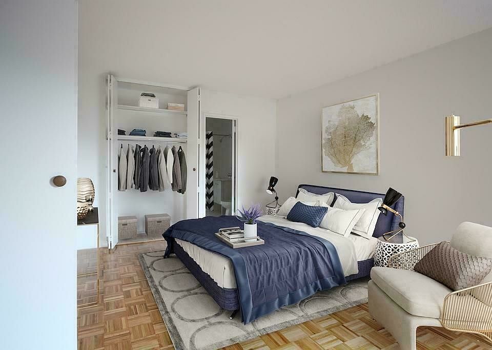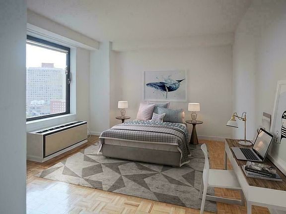 Two bedroom two bath apartment, easily converts to three bedroom. With master en suite bath, classic kitchen, lots of storage space, and mid floor north/west views to the plaza, city, and river. 1013 sq ft. Avail now.Two-acred landscaped plaza w/ river and city views, year-round activities schedule, playgrounds, on-site preschool, free Wi-Fi, sundeck, restaurant/lounge on site, groceries, banking, dry cleaning, shopping on-site