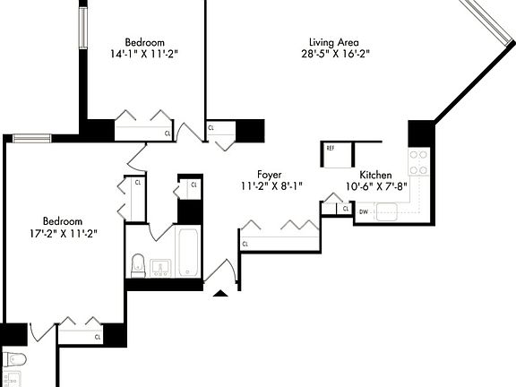 Two bedroom, two bath apartment with lots of great features including large, extended living area, new maple and granite kitchen, ample closet space, master en suite bath, and southeast/south/east high floor views to the river and city. 1062 sq ft.Two-acred landscaped plaza w/ river and city views, year-round activities schedule, playgrounds, on-site preschool, free Wi-Fi, sundeck, restaurant/lounge on site, groceries, banking, dry cleaning, shopping on-site