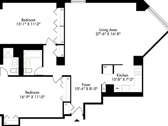 Spacious two bedroom, two bath apartment with extended living room, new maple kitchen, master en suite bath, generous closet space, and southeast/east/north views of the river and plaza. 1046 sq ft.Two-acred landscaped plaza w/ river and city views, year-round activities schedule, playgrounds, on-site preschool, free Wi-Fi, sundeck, restaurant/lounge on site, groceries, banking, dry cleaning, shopping on-site