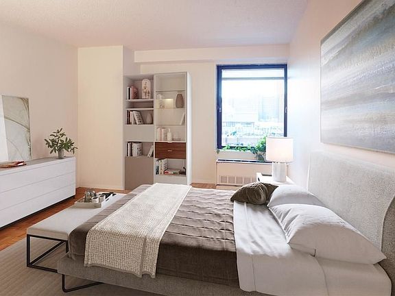 High floor studio apartment with ample storage space, private dressing area, classic kitchen, and north views to the river and city. 497 sq ft. Available 6/7.Two-acred landscaped plaza w/ river and city views, year-round activities schedule, playgrounds, on-site preschool, free Wi-Fi, sundeck, restaurant/lounge on site, groceries, banking, dry cleaning, shopping on-site