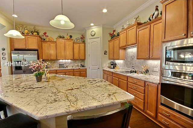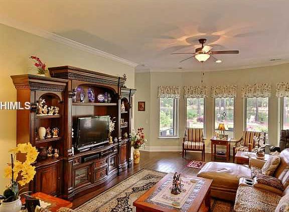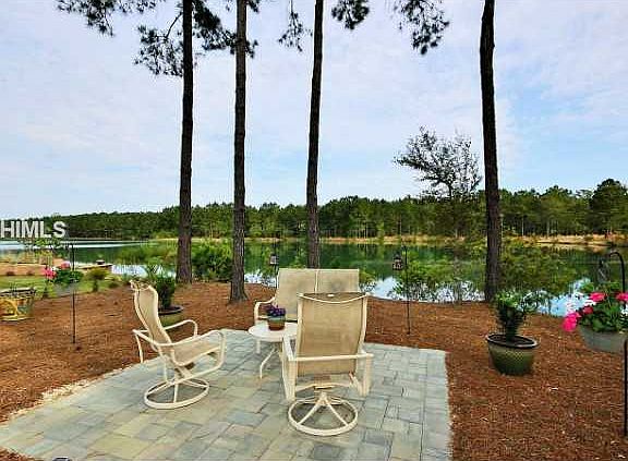 PEACEFUL LAKE LIVING Abundant views of largest freshwater lake in Hilton Head area are plentiful from this fabulous water front home featuring two owner's suites & French door study. Experience picturesque views from gourmet kitchen outfitted w/abundant cabinet space, granite, SS, island, & cook top, family room enhanced by bay window siting area, dining area w/transom windows, & master suite complete w/tile surround shower & closet adjoining to spacious laundry room w/sink. Extended & tiled screen porch, paver patio alongside lake, & world class amenities perfect this great open floor plan. (ZT)