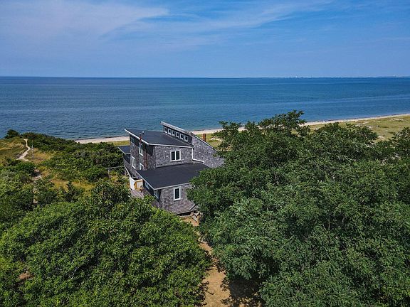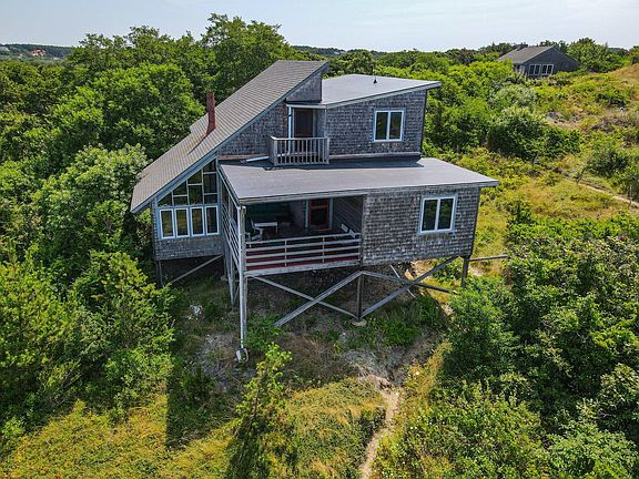 A magnificent South Truro waterfront mid-century modern home set high above Cape Cod Bay is being offered for the first time since it was built in 1952. One of the most beautiful waterfront sites along the Truro bayside was carefully chosen by mid-century architect Ray Brock for what was to be his family's summer property. From there, he took great delight in siting, designing, and building the home that is there today. Set high and back on the dune, the siting takes full advantage of how the dune falls away, giving the property water views that are more broad and expansive than other Truro waterfront properties. The outstanding view includes a rare sweep of the beach spanning from Fisher Beach around to Long Point at the tip of Provincetown. Special note: this area of the Truro waterfront is gaining beach, not eroding, which has been documented and mapped by the state. The 1952 build date is on the earlier side for the modern house movement on the Outer Cape, and the house has design elements often seen in much later modern homes, such as a step-down living room, different split levels, and a dramatic sloping roof. The design is exciting, and the house is well maintained, retaining all its original features and giving a vintage camp-like experience. It harkens back to simpler times and a slower pace of life. The home is in move-in condition or is a good candidate for winterizing and renovating to your tastes; the choice is yours.