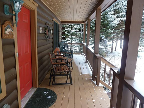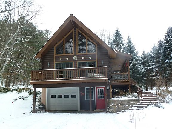 Contemporary Log home built in 2001. First floor is open concept which allows for great natural light and views abound. Custom flooring Teak wood in pristine condition livingrm,dining area and kitchen. Full bath and sep. bedroom first floor. Kitchen offers hickory cabinets and a small island. Slider goes out to a 10 x 20 deck with southern exposure. Kitchen ceiling is a unique wood laminate. Second floor offers a full loft with closet, storage, great space for a second bedroom, office, studio space you decide. Basement is partially finished with a half bath and laundry. Semi finished workshop area, and a one car under garage. Wonderful front porch 6 x 30 off the front of the house. Nature abounds cleared and wooded. This property sits up on a hill and you feel like you are the only home around. Loving landscaped with a stone wall, mature trees. Nice shed to remain for the buyer as well. Low Taxes, town sewer & free sewer, free rubbish pick up are all bonuses. Move in condition.