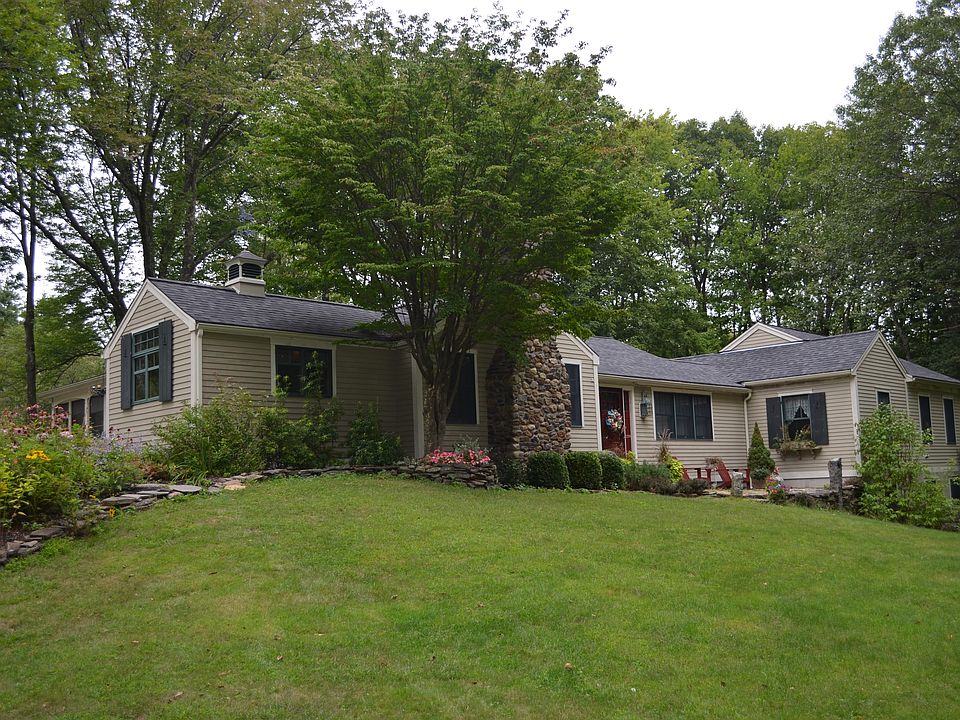 Gentleman's Farm set on approx 43 Acres of Peace and Serenity. Enjoy the charm of yesteryear with all of the modern amenities! The house was Expanded and Updated in 2007, the kitchen has SS appliances and granite counters w/ vaulted, beamed ceiling. Open Floor Plan, Kitchen opens to massive dining room with fieldstone fireplace and cathedral ceilings, step down to the living area (26' X 18'!) with french doors and picture window. All 3 bedrooms are on the same level and each has it's own updated bath, original tin ceiling in two of the bedrooms. Master Bedroom has cathedral ceilings, sliders and walk in closet. The lower level offers flexibility for expanded family with a carpeted family room, full bath, laundry and slider to the side yard. Screened Porch overlooks the bluestone patio and Koi Pond. Renovations include new Anderson windows, doors, clapboard siding, roof, electrical (220 amps), plumbing, well pump, oil tank, repointed fireplace as well as kitchen and bath updates. Outbuildings include Garage, Shed, Maple Sugar Shack, Well and Original Outhouse.