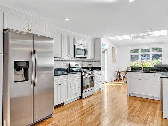 Beautiful Colonial on cul-de-sac in desirable West Roxbury neighborhood. Features modern kitchen with stainless steel appliances, granite counters, and gorgeous glass display cabinet. French doors from foyer lead to front-to-back living room with gas fireplace. Stunning family room addition overlooks lovely yard with flowering plants, mature trees, and natural stone walls. It offers abundant natural light with triple transom picture window, two skylights, and double sliders with transoms (one leading to private patio and the other leading to granite landing, driveway, and steps to your own sanctuary). Great upper patio with built-in custom pizza oven. Second floor offers 3 bedrooms and modern full bath with glass slider to tiled tub shower. First floor offers modern tiled half bath with granite vanity. Gleaming hardwood floors and freshly painted rooms. Enclosed portico, brick steps with granite treads, wrought-iron railings, and decorative shutters add to home's curb appeal.