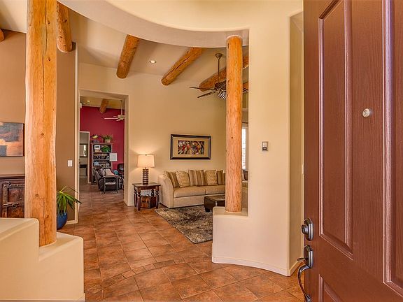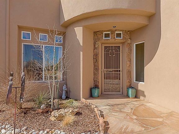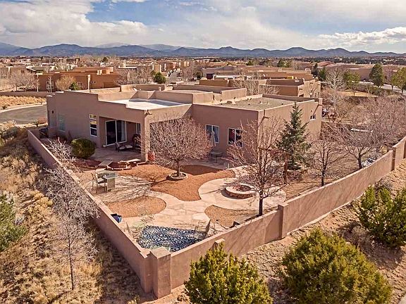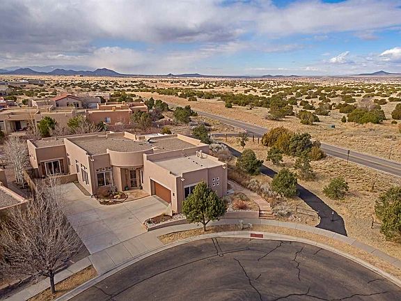 Stunning single story 5 bedroom 3 bath home immaculately maintained. Amazing mountain and sunset views from professionally landscaped yard. Privacy abounds, situated on the end of cul-de-sac with no neighbors to the West. Upon entry, you'll notice the high ceilings, large vigas and beautiful flooring. This versatile open floor plan offers 2 living areas and a formal dining room. The kitchen is large with ample cabinets, cozy breakfast nook and is open to the family room. The owner's suite is private with access to the portal. Owner's bath includes a separate tub and shower, huge closet with professional closet system. beyond the living areas are 4 more bedrooms and 2 baths. One is a true suite with an on-suite full bath. Great for guests, teen area or mother-in-law quarters. You'll want to spend lots of time enjoying the outdoor area. So lovely and private with both covered and uncovered areas boasting thick flagstone. Views of the Jemez mountains and incredible Santa Fe sunsets! Newer roof and stucco, radiant heat and fireplace. Partake in the walking/biking trails right outside your door!