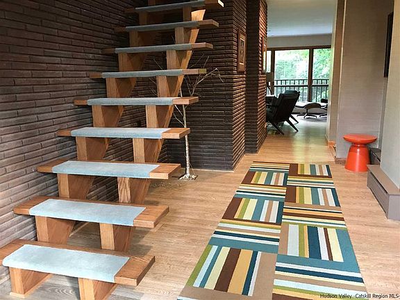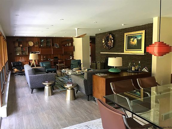 Mid-Century sophistication and functional modern style come together in this spacious, nearly 2700 square foot five bedroom home. Meticulously renovated and updated and thoughtfully designed to entertain both family and friends; everyone will be clamoring to come for the weekend . In the backyard, find the sleek and luxurious saline pool, installed in 2016, with surrounding bluestone patio, firepit, bocce court, treehouse, and outdoor grilling station. For a more intimate outdoor experience, the front patio off the kitchen awaits. The interior of the house is as enjoyable and cool as the exterior. Large open floor plan living/dining with fireplace and balcony that overlooks the outdoor fun. A cozy den area with a retro suspended fireplace adjoins the original 60's kitchen, sporting new appliances. Not included in the Sq footage, the downstairs, which leads out to the pool area, has been completely finished and includes a TV viewing area, laundry, dog shower, and mini kitchen set-up. Balconies are featured upstairs off all of the bedrooms including the generous Master with walk-in closet and sumptuously redone en suite bath. Woodstock village is just 7 minutes away but you may never want to leave this groovy scene.