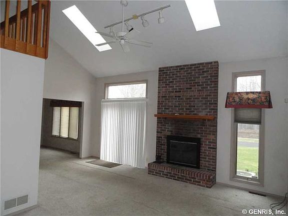 Great value with just a little tlc. Contemporary open design with large balcony overlooking the two story living room. Skylights, wood burning fireplace, sliding glass door to private deck. Huge master bedroom suite. First floor laundry. Ceramic tile through foyer, hallways, pwdr room and laundry. 2 car garage.