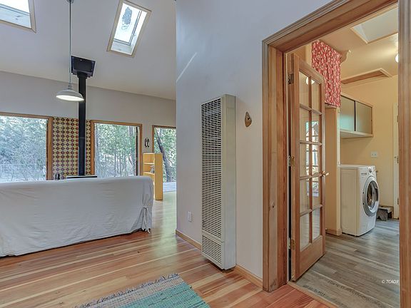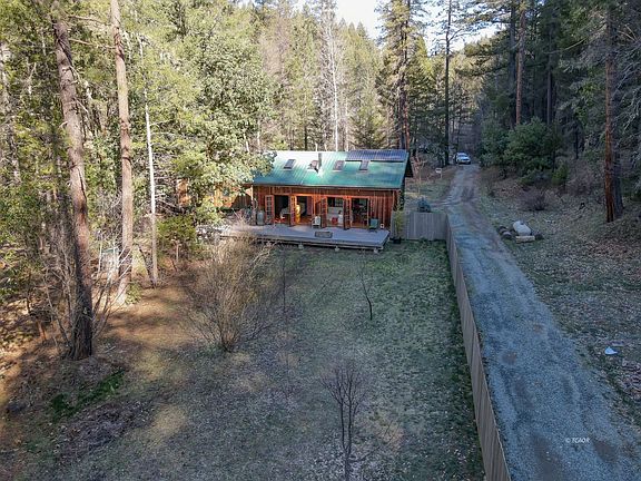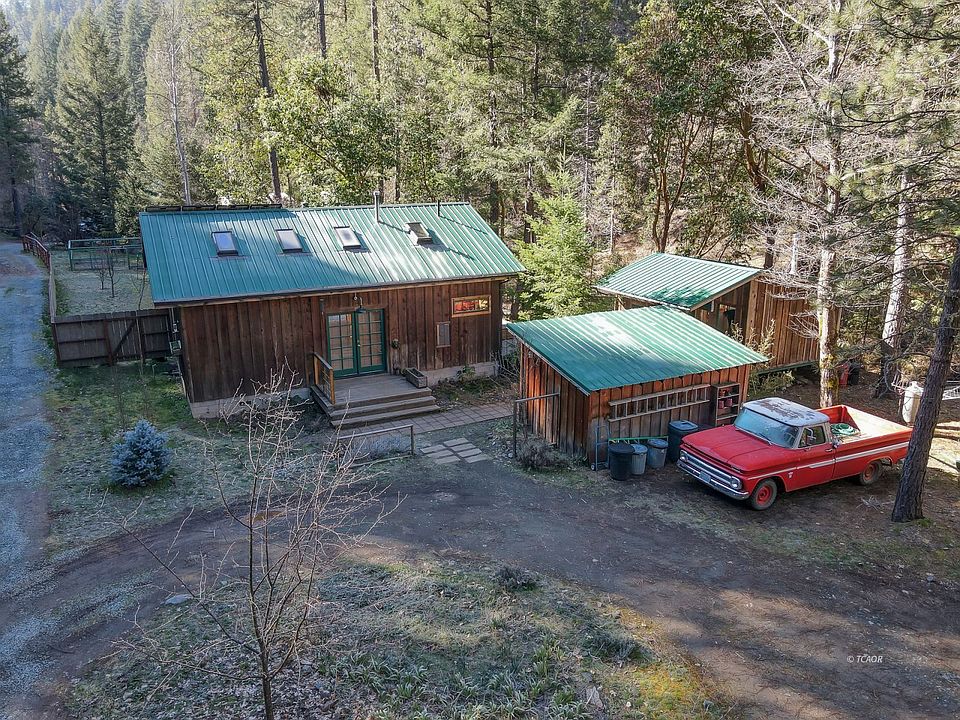 On 8 wooded acres sits this mountain retreat ready for your memories to begin. The main house has an open floor plan, kitchen features beautiful recycled glass counter tops with custom cabinets locally made. Douglas Fir wood flooring throughout the home. The ceilings are all vaulted with skylights through out the home. Bathroom features a claw foot tub, and a laundry washing machine. It has spacious storage through out, custom made for this home. Propane wall heat, cement block foundation. 4 french doors in the living areas lead out to a amazing deck overlooking your fruit trees, garden area and artists studio. Also features an outside shower on the side of the deck outside the bathroom. Just 2 steps away is a guest studio with a small wood stove and it's own private deck looking over the seasonal creek. Solar electric and spring-fed water with 2 twenty-five hundred gallon tanks for water storage. This is a must see to appreciate!!!